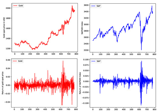 Gold spot price in USD and its return (in red) and S&P500 index and its return (in blue) against number of days starting from 18 September 2017 to 17 September 2020.