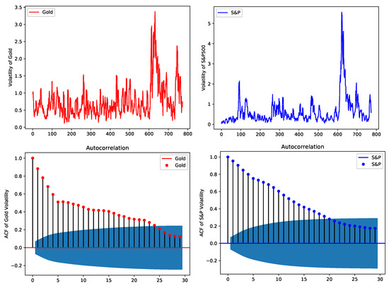 Volatility and ACF for Gold (in red) and S&P 500 (in blue).