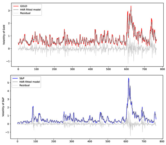 Fitted HAR model and residual using OLSE for the volatility of Gold and S&P500.