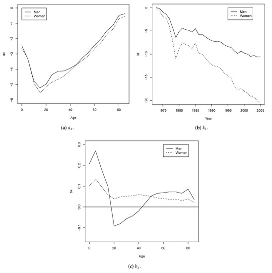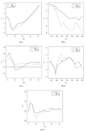 In Figure 2, the parameters of the LC2 model are shown. Comparing Figure 1 and Figure 2 in (a–c), it is observed that, in general, the parameters , , and exhibit behavior which is similar to both models. The parameter presents values close to zero, although the values decrease considerably in both sexes between 1975 and 1980. This second term only has an effect for a few years at all ages, improving LC’s fit. The parameter has higher values at early ages of up to 15 years, then decreases rapidly, with a peak approaching zero for women around 20 years; for subsequent ages, the value remains almost constant for both sexes (see Figure 2d,e).