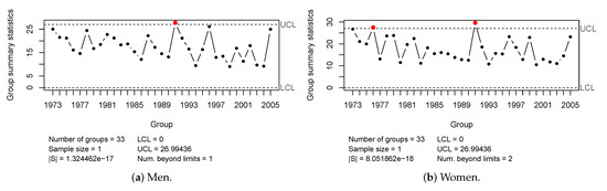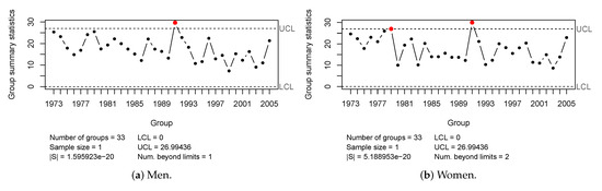 For the residual vector of the LC2 models, the year 1991 is out-of-control for men, and for women, the years 1976 and 1991 were detected (see Figure 4).