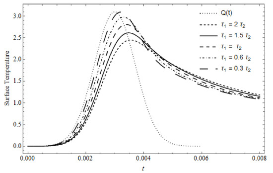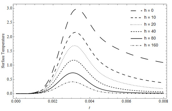 Figure 2 represents the time-dependent surface temperature, with as a parameter, calculated for and . As expected, the surface temperature clearly decreases with increasing values of the cooling coefficient; moreover, as the cooling coefficient takes small values, the maximum value of the surface temperature is shifted towards greater time than that of the maximum of Beside the general decrease in surface temperature with increasing , its behavior after it reaches its maximum, and at the times where the laser is switched off, decreases until the surface temperature approximately takes the shape of This behavior is due to the contribution of the cooling effect together with the conductivity of the material, especially after the laser is switched off and the absorbed energy is stopped.