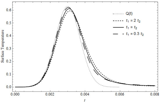Figure 4 represents the time-dependent laser pulse shape and the surface temperature, with as a parameter in the presence of heat losses, calculated for , , and . As seen, the effect of cooling is very pronounced, where the values of the surface temperature are decreased and its maximum is slightly shifted from the time of the maximum of . Moreover, after the laser is switched off, the temperature approximately reaches zero, which does not occur in the absence of cooling; these behaviors are due to the cooling and the conductivity of the material. The behavior of this figure is slightly similar to the behavior of the previous figure, where the time needed to reach the peak is slightely shifted towards greater time for than for
