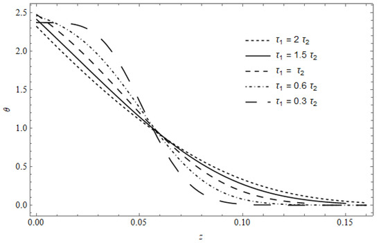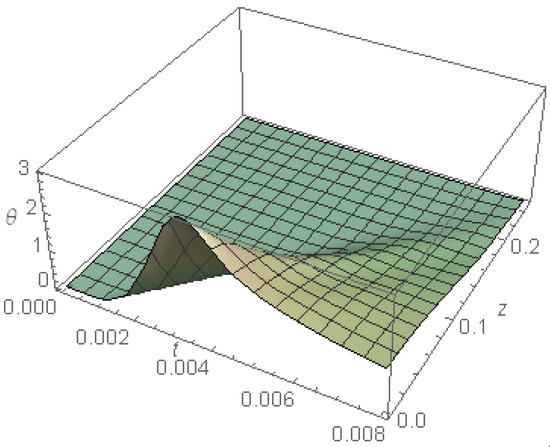 Figure 5 represents the temperature as a function of and in the absence of cooling, calculated for and . The finite velocity that distinguishes the DPL model appears evidently through the strong gradient at all locations, especially before the pulse is switched off. After the temperature reaches its maximum, a small temperature gradient begins to appear near the surface. The figure shows that the temperature is fully compatible with the time pulse profile, where the temperature increases until it reaches its maximum and then begins to decline. The temperature shows its highest value at the irradiated surface; this value decreases as z increases until it vanishes.