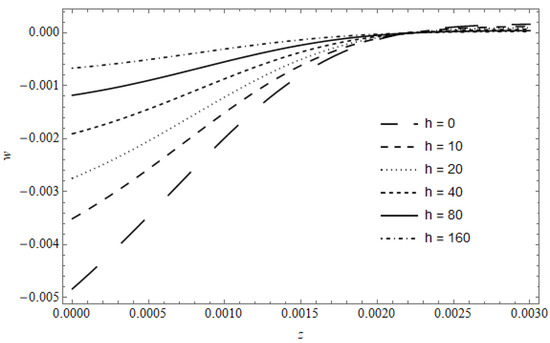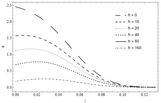 Figure 7 represents the temperature versus z, with as a parameter, calculated for and . As expected, the temperature decreases as h increases; moreover, a weak gradient near the surface is observed; this gradient moves deeper into the medium as increases. The maximum temperature is slightly shifted, nearer to the surface; this behavior can be observed from the value