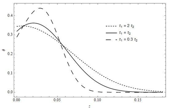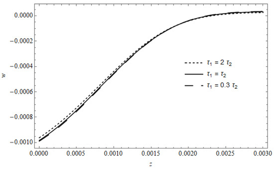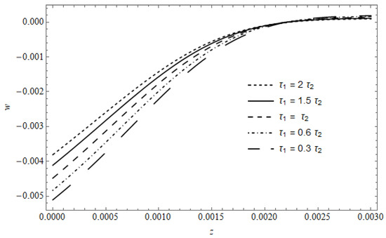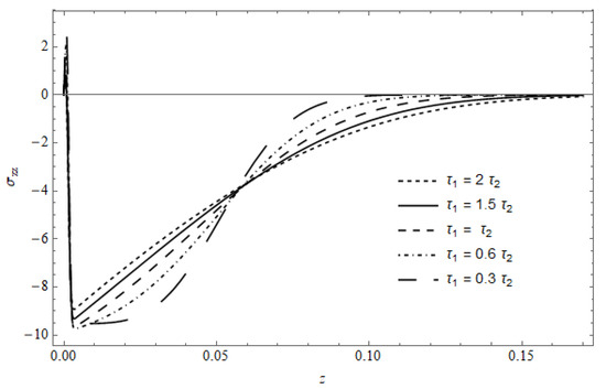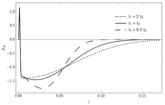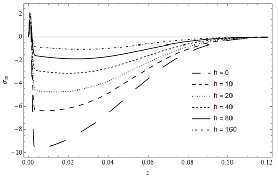 Figure 18 represents the stress component versus z in the absence of cooling, with as a parameter, calculated for and . The figure shows that the stress in the vicinity of the surface is slightly affected by ; as z increases, a pronounced effect for is observed, where the behavior of the temperature appears with (see Figure 8).