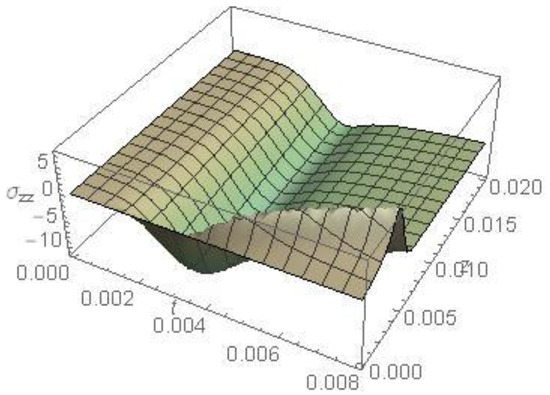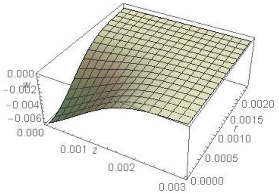 Figure 11 represents the component of the displacement of the medium as a function of and in the absence of cooling, calculated for and This figure agrees with the previous figure, where the maximum displacement is observed at the surface and decreases by increasing both and . The figure also shows a negative sign for the displacement in the r-direction; this behavior is due to a decrease in the distance between the particles in the r-direction.