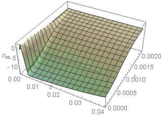 Figure 17 represents the stress component versus z, with as a parameter, calculated for and . As seen for different values, the stresses in the vicinity of the surface are almost identical in their gradients. As z increases, the performance of the temperature with cooling appears evident, as in Figure 7.