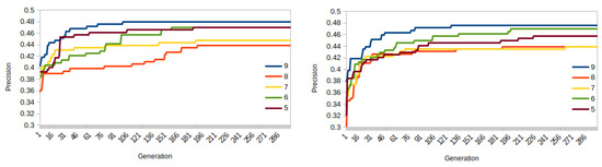 The intuition about local maxima is reinforced by looking at graphs in Figure 1 and Figure 2 where the dynamics of the evolutionary process are illustrated for the Netscience and ia-radoslaw-email data sets, for both meta-correlations. Charts on the left show the performance improvement from generation 1 to 300 for meta-correlation , on the right for . Each line represents the evolution on a fold, following the DE RAND/1/EXP strategy; for readability, only the behavior on a subset of folds is shown.