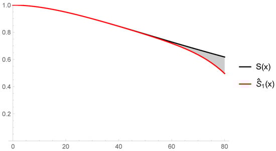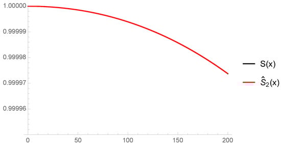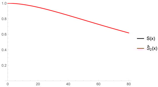 Theorem 2. Let and be nonnegative random independent variables representing the absorption times in two homogeneous Markov processes with state space and , respectively, where and are the transient states in each process and and are the absorbing ones. Assume that both variables are PH-distributed with representation and , respectively. Then, an approximation of the survival function for the sum is given by Equation (11), where is the initial probability of entering the absorbing state , , and . Moreover, an error bound of the approximation error is given in Expression (13), where and is the Frobenius norm. Notice that the error bound increases exponentially with time x, and consequently, for predictions, it would not be accurate. Thus, in the following section, we propose a second approximation method for the distribution function to improve this last obtained result.