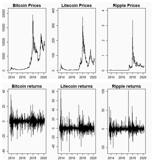 Cryptocurrency prices and returns for Bitcoin, Litecoin, and Ripple series. Daily prices from 4 August 2013 to 6 March 2020 (2407 observations).