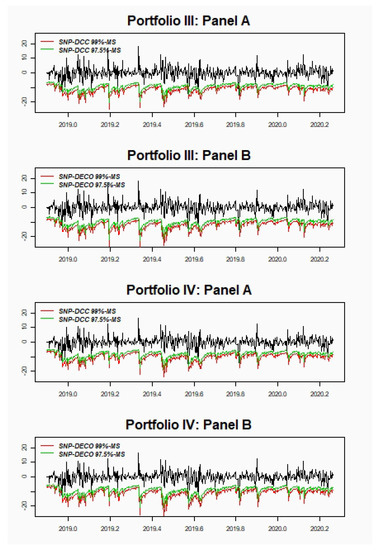 Once again, similar results are obtained in terms of the MS risk measure, since it is computed as a VaR but with a higher confidence level. The performance of the DCC and DECO models in terms of 99%-MS and 97.5%-MS is displayed in Table 4 and depicted in Figure 2. The null hypothesis for the CC test is not rejected in any case, except for Portfolio I for 99%-MS for DCC-SNP model. Each pair for 97.5%-MS of Portfolio I, II and IV have the same good results. In the case of 99%-MS, Panel B (DECO model) for all the portfolios seem to have better results than Panel A where a stronger weight of LTC in the portfolio fits better to 99%-MS. For 99%-MS the best models are for the SNP-DECO, although for 97.5%-MS the results are more homogeneous between models. The DQ test has similar results to the CC test although it is also rejected even when the p-value in the CC test is close to 0.11.