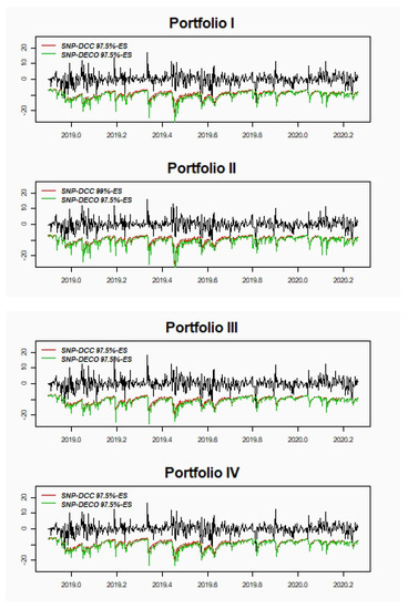 The multinomial test considers the numbers of exceptions in each day for the different levels of VaR, considering a maximum of eight (N = 8) of exceptions, setting a vector which follows a multinomial distribution where Pearson and Nass tests are used to assess the model performance—see also [32] for a related backtesting ES technique. Critical values (considering a backtesting period of 500) for both tests for N = 8 are 15.51 and 12.77, respectively. It should be pointed out that the approximation ES is an average of VaRs and the behavior in comparison to ESR-Intercept is slightly different, being more accurate the latter. According to Pearson and Nass test, Portfolio II and III, those with the highest volatility, are not rejected, especially Portfolio II where DCC seems to be preferable than DECO. The comparison for 97.5%-ES for both models and the four portfolios are also presented in Figure 4.