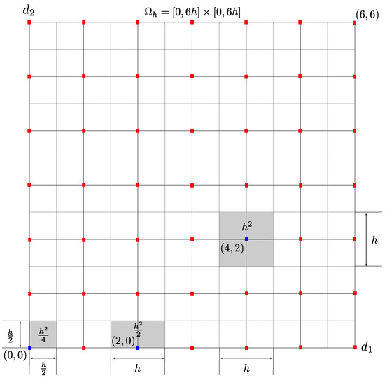 We will divide the space domain () into a grid with step h, transforming it into a discrete domain containing the elements where and with and .