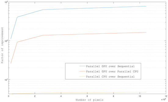 We can see a plot of the data in Table 1, Table 2, Table 3 and Table 4 in Figure 3. As expected, the GPU implementation performed very well, obtaining better results by a factor of up to (see Figure 4).