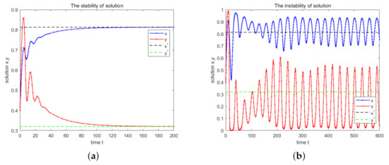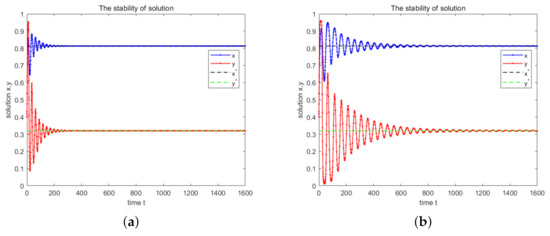 Similarly, we set up two sets of parameter data to test our conclusions: (1) , , , , , , , or ; (2) , , , , or . We calculate the upper bound of the asymptotic stability according to the condition in Theorem 2 where the minimum equals 3.6. If , the mixed evolutionarily stable strategy is asymptotically stable under the replication equation. For the second set of parameters, whether or , the mixed evolutionarily stable strategy is asymptotically stable according to the condition in Theorem 5.