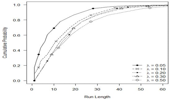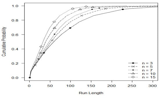 The profiles’ values of the proposed chart are provided in Table 1 for selective choices of by fixing . From Table 1, it is observed that if we increase the value of the values of the chart decrease, and vice versa (for example, when ). The MDRL values are smaller than ARL values which specify that the distribution of the RL is positively skewed (Table 1). The SDRL values are decreased as the value of increases (for example, when (Table 1)). We have also checked the performance of the proposed chart for various choices of and it is reported in Table 2. The values of the chart decrease as the value of n is increased for a fixed choice of and (for example, when ). Moreover, the RL curves of the proposed chart are provided in Figure 2 and Figure 3 for various combinations of . It is noted that as the value of increases, the RL values of the chart are decreased for a fixed choice of and (Figure 2). From Figure 3, it is seen that as the value of increases, the RL values of the chart decrease or are fixed values of and .