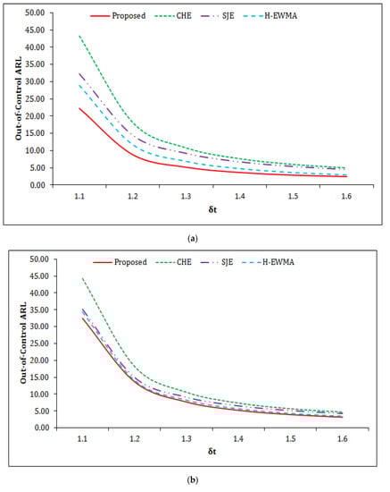 The comparisons of the proposed chart with the existing charts are provided in this sub-section. For comparison purposes, the following existing charts are included: , , and H-EWMA proposed by References [6,9,10], respectively. The performance comparisons between proposed and existing charts are also judged by using another measure called the percentage decrease in , hereafter labeled as PD-ARL. The PD-ARL can be computed by using the formula [18]. A chart having a larger PD-ARL value is considered to be efficient. We have fixed the at for valid comparisons.
