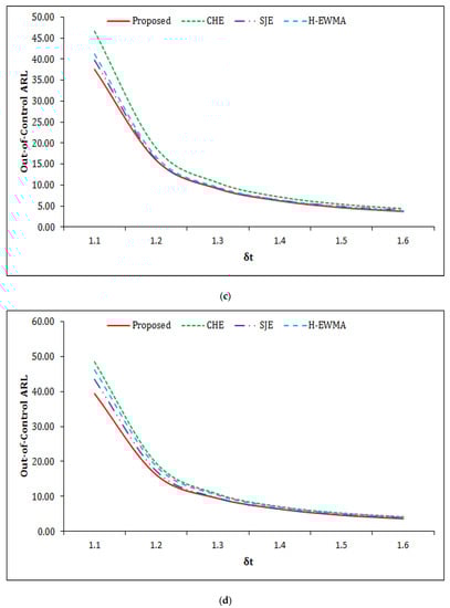 In this sub-section, we have also presented the -based graphical comparisons of the chart with the existing charts. From Figure 4a–d, it is noted that the performance of the proposed chart is relatively better than the , , and H-EWMA charts for all selected choices of and . It is found that as the value of increases the differences between the proposed and existing charts are decreased (Figure 4a–d). The performance of the is far better than the and for selected choices of under selected choices of (Figure 4a–d).