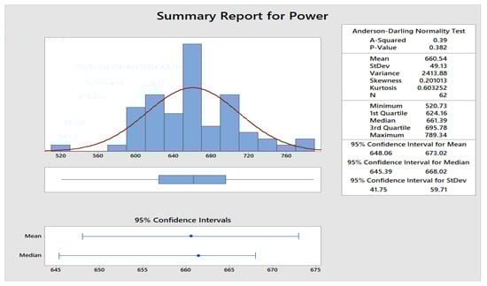It is a tenable fact that the world is shifting focus from fossil fuels to renewable energy owing to CO2 emission associated with fossil fuels during operation. Saudi Arabia subscribed to this initiative. Also, the increase in energy demand calls for the exploitation of other available cost-effective energy sources. Harnessing the readily available renewable energy sources such as wind and solar helps meet energy demand in a remote area and contributes significantly to the national grid. Extensive work has been carried out on wind data from various wind farms in the Kingdom; however, in the context of the control charts this is the first application. Wind speed data is available from different sources in the Kingdom. Among these are Saudi Aramco, Meteorology and Environmental Protection Administration (MEPA), and King Fahd University of Petroleum and Minerals (KFUPM) [20]. Wind power is the application of air flow through wind turbines to generate electric energy. The important parameter influencing the rate of energy generated in a wind farm are wind speed, wind direction, air temperature, and global solar radiation. Hourly metrological data was obtained from the meteorological monitoring station in the Eastern Province of Saudi Arabia [21]. The pictorial representation of the Dhahran wind farm is presented in Figure 5. We have also applied the Anderson Darling test to check the distribution of the Dhahran wind farm data, and from this test, it is observed that the distribution of the wind farm data is normal (Figure 6). We have considered the , and charts to possibly examine the deviations in the process variance by fixing .