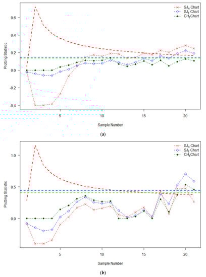 We have presented two examples based on wind farm data. In the first example, the first 10 subgroups are considered IC, and a shift of size 1.2 is introduced in the next 11 subgroups with (Figure 7a). In the second example, the first 16 subgroups are considered IC, and a shift of size 1.5 is introduced in the next 5 subgroups with (Figure 7b). The description of the wind farm data along with the plotting statistics of , , and charts are reported in Table 4. From Figure 7a, it is seen that both the and charts trigger the signal at the 17th subgroup point, whereas the charts do not trigger any signal. From Figure 7b, it is observed that the chart has detected the OOC signals at the 17th subgroup point. However, and charts trigger the OOC signal at the 19th and 20th subgroup points, respectively. These illustrative examples clearly show the superiority of the chart as compared to the and charts. The real life application also supported the findings in Section 3.