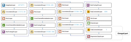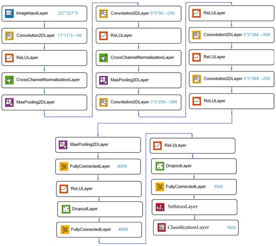 In this study, we used modified AlexNet (see Figure 1). AlexNet [12,13,14,15] is the name of a convolutional neural network (CNN), designed by Alex Krizhevsky and published with Ilya Sutskever and Krizhevsky’s doctoral advisor Geoffrey Hinton [12]. AlexNet competed in the ImageNet Large-Scale Visual Recognition Challenge on 30 September 2012, significantly outperforming other networks. In the original AlexNet, there are only 8 levels (5 convolutional and 3 fully connected). It is possible to load a pretrained version of the network trained on more than a million images from the ImageNet database [12,13,14,15]. The pretrained network can classify images into 1000 object categories, such as keyboard, mouse, pencil, and many animals. As a result, the network has learned rich feature representations for a wide range of images. The network has an image input size of 227 × 227.