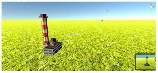 In the game application Unity, the model scene was created, containing an airport control tower in the middle of an endless green field (Figure 2).
