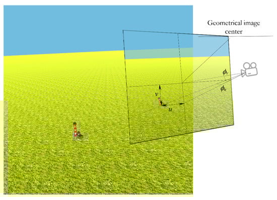 Let us describe the first stage here. We solve here the task to find the horizontal and vertical coordinates u and v of the object origin projection in a large image (Figure 4). These coordinates are equal to the pixel coordinates of the object origin projection according to the center of the image, divided by the focal length of the camera:
