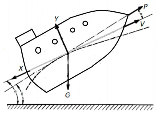 - α—Angle of attack, i.e., angle between longitudinal axis of a drone and projection of drone velocity on the symmetry plane of the drone. The drone flight is described by the system of nonlinear equations [16].