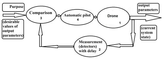 Automatic control: flying drones have output parameters (output of block 1) describing their position, orientation, and velocity. These parameters are measured and calculated by a measurement system with some time delay (output of block 2). These measured parameters and their desirable values, calculated from the steady-state trajectory (inputs of block 3), can be compared, and deviation from steady-state solution can be calculated (output of block 3). Automatic pilot gets these deviations and calculates control parameters for the drone to decrease these deviations. Then, the drone changes its output parameters (output of block 1). This cycle repeats at all times of the flight.