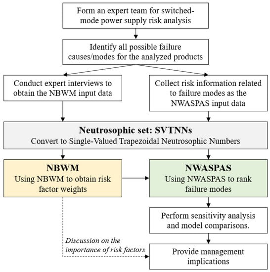 Through an extensive FMEA literature review, some research gaps were found in this study. As mentioned earlier, FMEA is based on expert judgment []. In some cases, if the experts are not confident or unable to make appropriate judgments, that will lead to uncertainty in the risk analysis process [,]. In addition, only S, O, and D are considered in most FMEAs, and only a few studies have explored the management costs of failure modes. In the methodology section, a risk assessment model combining NBWM and NWASPAS methods has not been proposed in past studies. In particular, the proposed FMEA model has never been used in the switching power supply, one of the important parts of electronic products. In Section 3, the analysis process of the proposed FMEA model is explained.