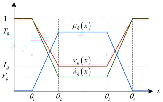 The value range of,, andis between 0 and 1, normally expressed as a percentage. An SVTNN can be expressed as. It belongs to a special neutrosophic set in the real number set R, where,, andare expressed as truth-membership, falsity-membership, and indeterminacy-membership functions. The membership functions of,, andare shown as Equations (1)–(3) [,].