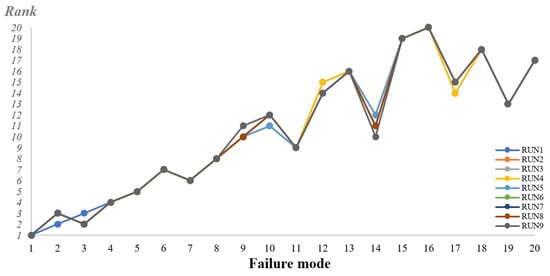 The integration of the two parameters WSM and WSP is used for sensitivity analysis. This study set these two parameters to be configured with equal weight (λ = 0.5), which means that the parameters have equal importance in the beginning. The reason for taking this approach is to ensure the robustness of the proposed model not being affected by the different weights of WSM and WSP. Table 15 shows the failure modes for different risk scores, with the parameter ranging from 0.1 to 0.9 (lowest to highest). According to Figure 3, there is no significant difference in the ranking result even though the parameter is changed. Therefore, it is justifiable to set the parameter = 0.5.
