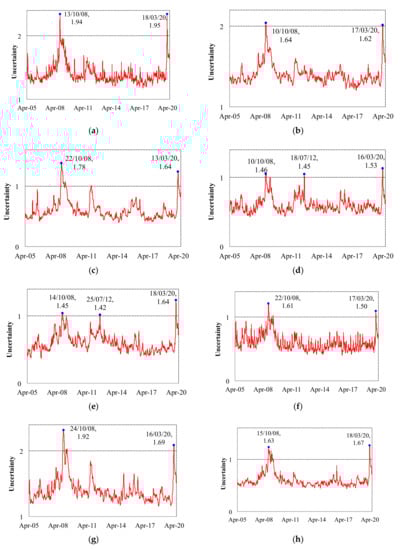 In Figure 1a–h, we present the eight uncertainty indicators estimated for the European countries in our sample: Belgium, France, Germany, Italy, Spain, Sweden, Switzerland, and the United Kingdom, from 1 April 2005 to 25 June 2020 (see also the Supplementary Materials). The indicators were normalized to have a mean equal to 1. A value of an indicator above 1 refers to a situation of relatively high uncertainty in a given day, while a value below 1 refers to a low-uncertainty period. Notice that the index being relative to each country’s own mean, eases the interpretation of the individual uncertainty dynamics in time, but it would be inaccurate to compare the level of uncertainty across countries.