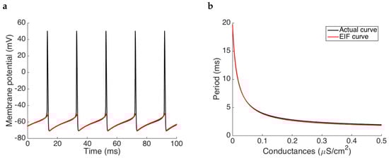 The curve can be provided in several ways: (I) from dynamic clamp experiments, using in vitro recording; (II) approximating the real data by a base model (IIa) for which we can obtain an analytic expression for the curve, such as the leaky or the quadratic integrate-and-fire models (see [35,36]), or (IIb) allowing an approximate expression for the curve, such as the McKean model (see [26]) or the exponential integrate-and-fire (see Section 2.1); finally, (III) using a more detailed model that can be numerically integrated in order to construct a curve table, that is, providing a set of period-conductance pairs extracted from numerical experiments (see Section 2.2). Once the relationship is obtained, we have an expression of the period depending on the conductances (or vice versa). In cases (I) and (III), where we have a discretization of this relationship, in order to obtain a continuous function , one can interpolate the data using, for instance, the piecewise cubic Hermite interpolating polynomial (PCHIP). Therefore, given an interspike interval , the corresponding conductance within this interval can be obtained by solving analytically or numerically the equation .