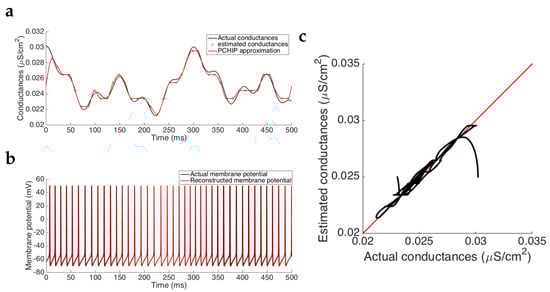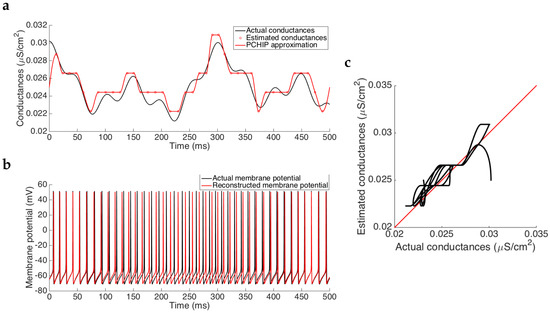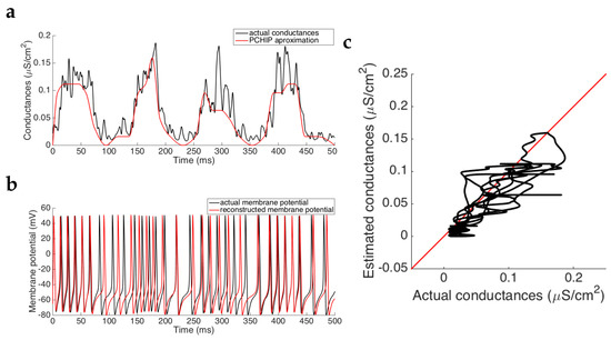 Results of the estimation procedure for a membrane potential from a stellate cell model using the same model as a base model in the estimation procedure. Panel (a) shows the prescribed conductances (black curve) and the estimated conductances (red curve). Panel (b) shows the membrane potential (black curve), obtained from the stellate cell model described in (4) when the prescribed conductances of Panel (a) has been used, while the red curve depicts for the reconstructed membrane potential, obtained also from the stellate cell model but using the estimated conductances. Panel (c) shows the scatter plot of the prescribed conductances versus the estimated ones. The red line represents the identity line.