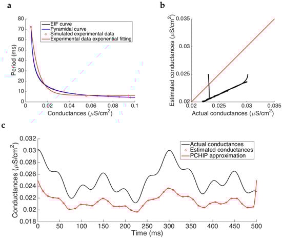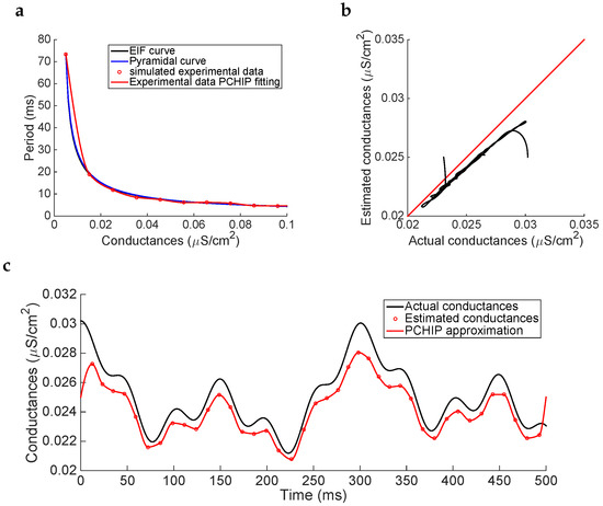 Applying now the estimation procedure to the membrane potential shown in Figure 3b (black trace), using the simulated experimental curve instead of an approximate base model to generate the curve, the results show how the estimated conductances are clearly underestimated (see Figure 6b,c) and, even though the frequency of oscillation of conductances is maintained, the amplitude of the oscillation is reduced. This fact is mainly due to misestimations that arise in the experimentally fitted curve (with respect to that obtained with the actual model), specially the underestimation obtained for those values of conductances between and , which is in fact the interval where the actual conductances lie.