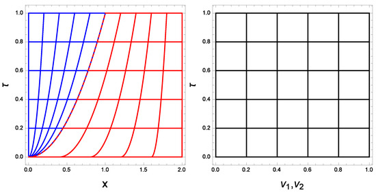 Let us first consider the region occupied by the first phase bounded by and , marked in blue in Figure 2. For Equation (13), it is convenient to replace the spatial variable with the following similarity variable [28]: