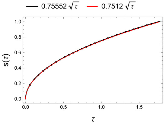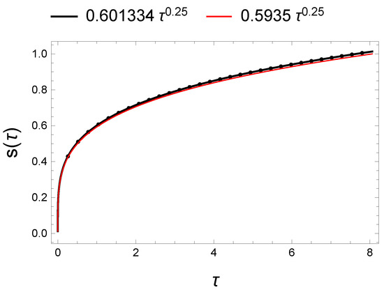 An important result with respect to this paper is the closed analytical solution of the two-phase fractional Lamé–Clapeyron–Stefan problem in a semi-infinite region obtained by Roscani and Tarzia [21], which is recalled in Section 3. The problem involves determination of three functions, namely, , and S fulfilling two subdiffusion Equations (13) and (14) and additional differential Equation (18) (interface energy balance condition) governing function S. The authors showed that and can be expressed in terms of the Wright’s function, while the location of the phase-change interface is described by power function (21), where parameter p can be evaluated form transcendental Equation (22). This solution is especially useful for validation of the numerical method proposed in Section 4.