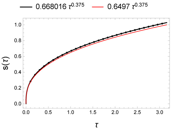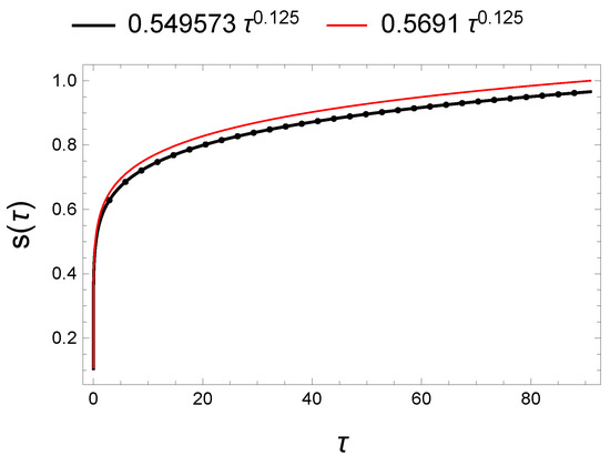 Let us now analyze the impact of the physical parameters on the solution for the fixed value of . Comparing the first and second rows of Table 1, we notice that p is a decreasing function of . This observation results directly from Equation (18). For a growing heat a flux in solid zone ( is increasing), heat balance in the melting layer is preserved only when the value of the Caputo derivative of function S decreases. For , the fractional derivative of function S can be interpreted as a velocity of movement of the melting front. The opposite behavior of the melting process is observed by analyzing the first and third row of Table 1 for the fixed value of , coefficient p is an increasing function of parameter .