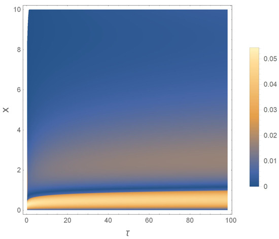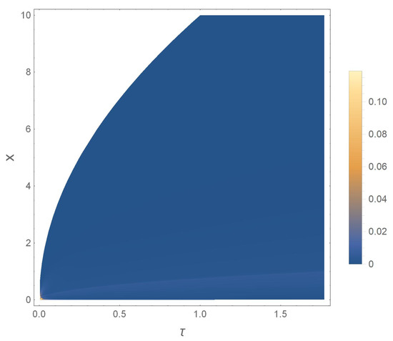 Figure 11, Figure 12, Figure 13 and Figure 14 lead to an important observation. In all considered cases, we note the highest absolute error for small values of variable and in the area close to the moving boundary . The calculations were performed in the mesh nodes fulfilling condition .