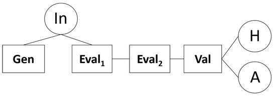 In particular, the sets are needed to control the transition between the different ’s phases, namely: generation, linear evaluation, quadratic evaluation and validation. These phases are represented by different subnetworks as explained below. The set X is the set of symbols representing the indeterminates . Similarly, the sets and the set encapsulate the symbols with the values assigned to the indeterminates when they are evaluated in each phase of and require some evaluation. The symbols are trash symbols required for some transformations at different phases of the computation. Finally, are punctual transformations of the control symbol in order to indicate the final evaluation of the Equation (4) for a picture. - The underlying graph G of our proposed is depicted in the Figure 1. The nodes In, H and A are the input, halting and accept nodes, respectively, while the boxes Gen, , , Val are subnetworks representing the different stages or phases for computation. In particular, the box Gen represents the subnetwork in charge of the combinatorial task for generating all pictures containing the different values for the indeterminates for each input picture. Also, both boxes and represent the subnetworks for the phases of evaluation. The former represents the subnetwork that computes the evaluation of the row of a given picture, namely, the evaluation of the terms , while the latter represents the subnetwork that computes the evaluation of the first n-rows of a given picture, namely, the evaluation of the terms . Finally, the box Val represents the subnetwork in charge of the phase for selecting the pictures that satisfy the Equation (4). Detailed description for each subnetwork as well as the and A nodes are introduced in the Section 4.1, Section 4.2, Section 4.3, Section 4.4, Section 4.5. In addition, the internals for each subnetwork are given in the Figure 2, Figure 3, Figure 4 and Figure 5.
