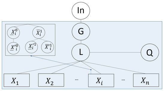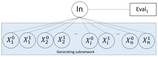 According to the Figure 2, each indeterminate is represented by two nodes, namely, and . Concretely, the node replaces all occurrences of symbol for the symbol (which represents 0). On the other hand, the node replaces all occurrences of symbol for one symbol (which represents the value 1). After n processing steps, the subnetwork will have modified all symbols and generated configurations for each initial picture . These configurations will be collected by the In node. The internals of each node in this subnetwork are defined in the Table 2.