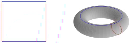 where the standard Cartesian distance is used in the right part. Therefore, the opposite sides of are welded by pairs. This yields the plane torus displayed in Figure 1.
