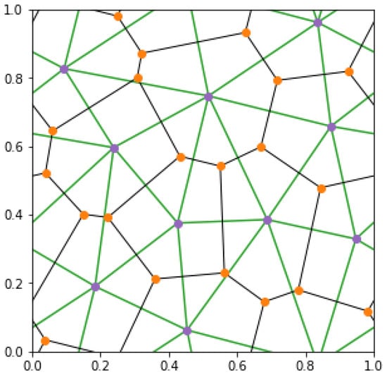 Square cell ; toroidal Voronoi tessellation (black lines); toroidal Delaunay triangulation generating a graph (green lines for E in on-line version).