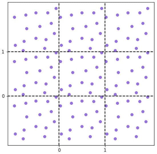 We now outline computer implementation of toroidal Voronoi tessellation and Delaunay triangulation. First, take , nine copies of the initial set A, as illustrated in Figure 3. Second, construct the Euclidean Voronoi tessellation and Delaunay triangulation for this set B using the standard Delaunay and Voronoi implementations available in the SciPy package [19]. A multiplied domain contains points which results in a certain slowdown in computing both structures. Nevertheless the increase of the number of points is linear which makes it negligible in the relatively small datasets (up to a few thousand points).