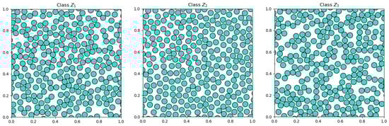 The particular classes of Z-distribution different by the distance probability distributions are displayed in Figure 5. Three types of the pair particles interactions are used in simulation: neutral (), attractive () and repulsive (). They generate models with various degrees of clustering. In the present paper, three classes of distance disks distributions, respectively, three classes of graphs are studied. The distance probabilistic distribution between the points A is independent of the distribution of A in the cell. Each class consists of 100 locations of 256 disks whose centers are placed inside the cell .