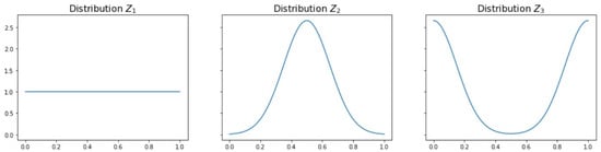 First, the set A is defined inside cell so that points are placed on a regular lattice or generated as a result of Random Sequential Adsoprtion procedure [18,23]. These points represent centers of disks. To produce a new distribution from A with varying degree of clustering, each point is shifted, where the shift is parametrized by an angle (direction) and a distance. Both parameters are chosen at random with following constraints: both angle and distance are randomly sampled and the distance is limited so that after performing the shift, the new location does not collide with any of the remaining disks. Distributions used for the distance sampling are shown in Figure 4 and called the Z-distributions. The process described above is a particular case of the Markov random walks.