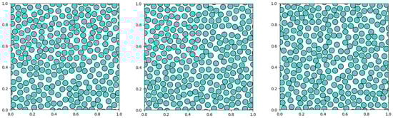 Diversity of the real two-phase dispersed structures implies diversity of the theoretical distributions of inclusions. Though we consider circular inclusions, their arbitrary locations allow forming clusters of various shapes. Technological processes can include the addition of moderator leading to attraction or repulsion of particles to spontaneously generated clusters [21,22]. We simulate points A by random walks in combination with three distance distributions which model various interactions among particles. Separate simulations are performed by RSA (Random Sequential Adsorption). In the present section, we follow the disks generation algorithm developed in [18] and used in the further simulations. The main idea is outlined below, and the details can be found in [18]. The difference consists in the regimes of moderate concentrations investigated in [18] and densely packed disks simulated in the present paper.