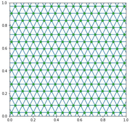 To verify the correlation between distribution regularity and the relatively low values of energy, we consider the hexagonal array. This yields also a completely regular Delaunay triangulation shown in Figure 9 containing only the equilateral triangles. The resulting graph has edges of identical length, and hence, the same gaps from (3).